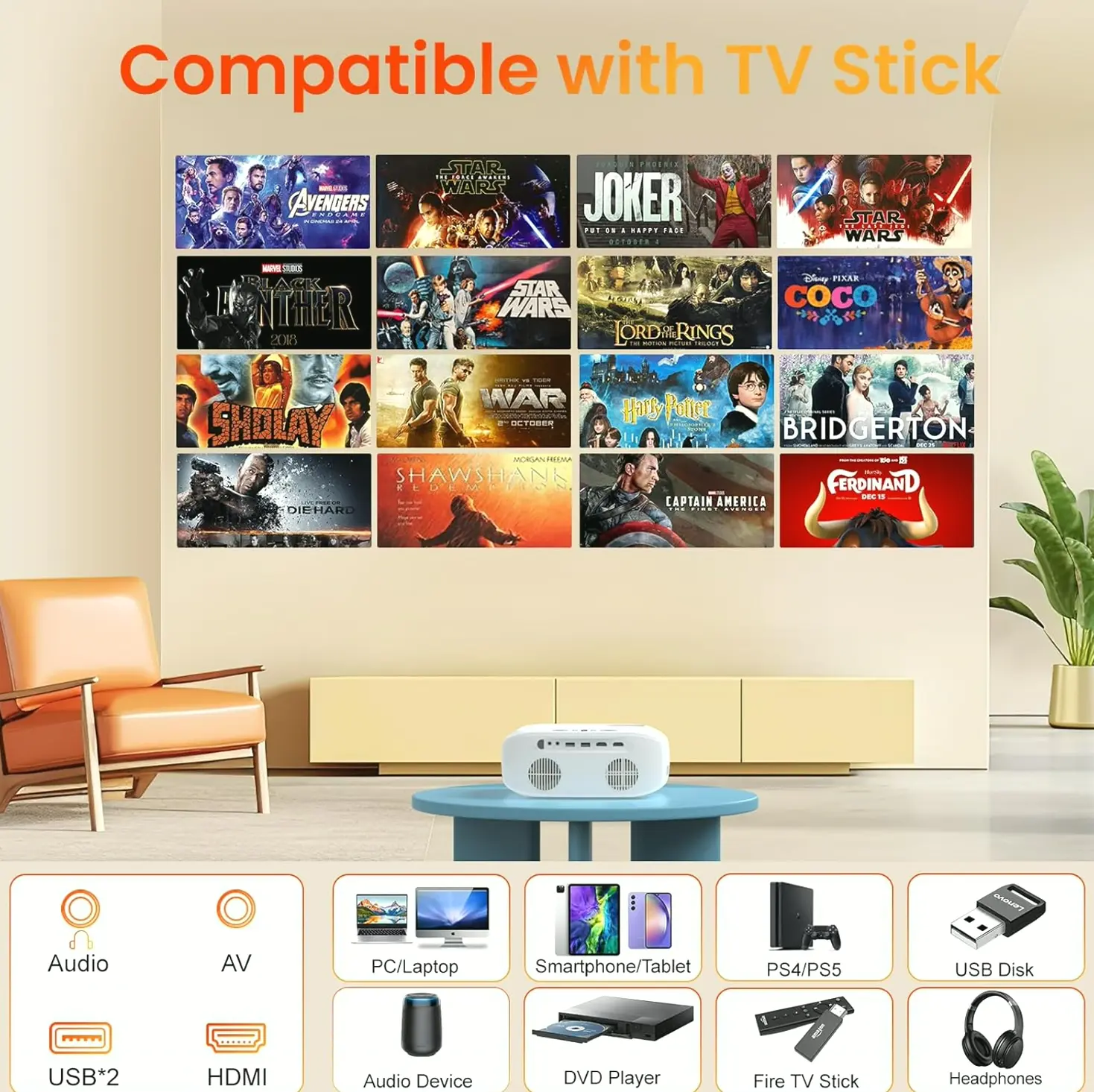 Experience the Ultimate Home Theater With the Brand X Full HD projector, delivering an immersive lumens display as large as 300″ on any flat white wall. Forget waiting in line for movie tickets—enjoy at home from your couch or bed. Screen sharing is effortless with our projector, featuring 2.4GHz & 5GHz Wi-Fi for seamless gameplay and video viewing. The Bluetooth 5.2 integrated Hi-Fi speaker ensures crystal clear audio without distracting neighbors; connect to any Bluetooth speaker or soundbar. (Note: Bluetooth doesn’t support mobiles or voice assistants, only audio devices). Multi-Support: Benefit from support with Smartphone, Notebook, USB drive, Disc player, PS5, and more. (Because of application issues, apps like Netflix, Prime Video, Disney+ need linking with other devices such as wireless dongle). The 100-inch Screen included with the Brand X projector is ideal for outdoor screenings, making it a great gift for loved ones. Supported by a 24-month warranty, reach out for any issues.