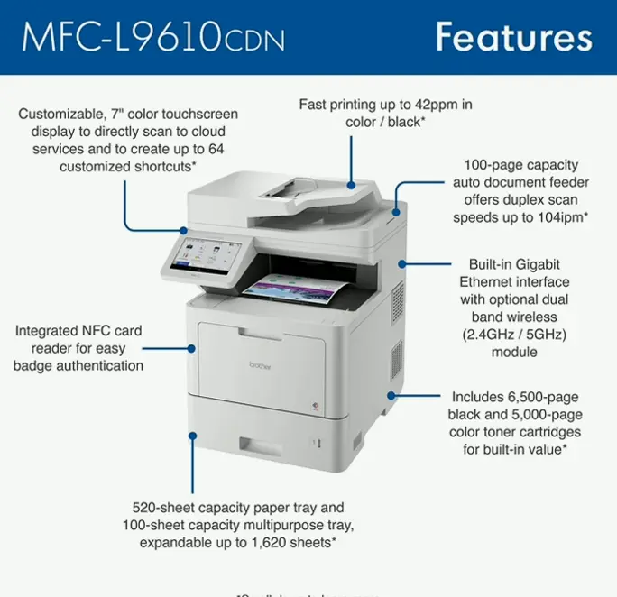 Enjoy rapid print speeds and scan functionalities: The Brother Business-Grade Multifunction Laser Printer provides blazing print speeds up to 42ppm along with duplex scan speeds up to 104ipm, increasing workgroup productivity.