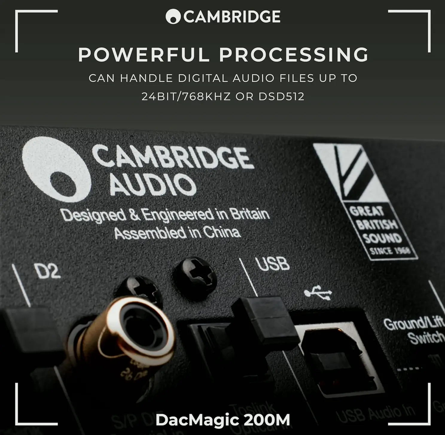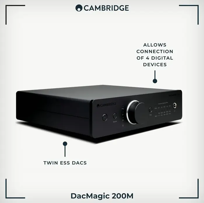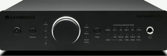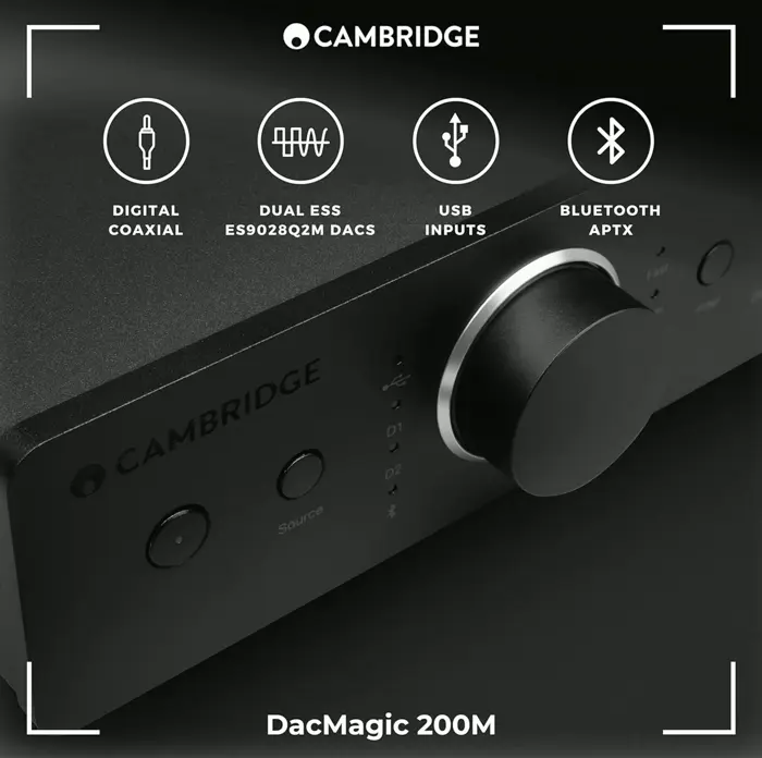 Experience incredible sound conversion. The DacMagic 200M flawlessly performs DAC conversion, letting all types of digital audio systems perform better than ever when it reaches your ears. Artist approved sound. The DacMagic 200M is Cambridge Audio’s first device to support MQA. MQA is an renowned UK technology that offers studio-like audio in a file small enough to stream. Robust performance. Inside sits a pair of premium ESS Sabre DAC converters. They handle electronic audio tracks up to 32bit/768kHz or DSD512, processing playback of any kind stored on CDs, smartphones, computers – or anywhere else. Simple connections. Optical optical, digital coaxial, and USB inputs ensure CD players, game consoles, notebooks or any other digital devices can be easily hooked up. Bluetooth aptX also lets you wirelessly stream files from your smartphone or device. Technical specs – Dual ESS ES9028Q2M DACs, Frequency Response 10Hz to 50kHz (±1dB), Max Power Consumption 12W, Signal to Noise Ratio >115dB (A-Weighted), Digital Filter: Selectable (Fast – Slow – Short Delay), Dimensions 2.0″ x 8.6″ x 7.6”, WEIGHT 2.6lbs.
