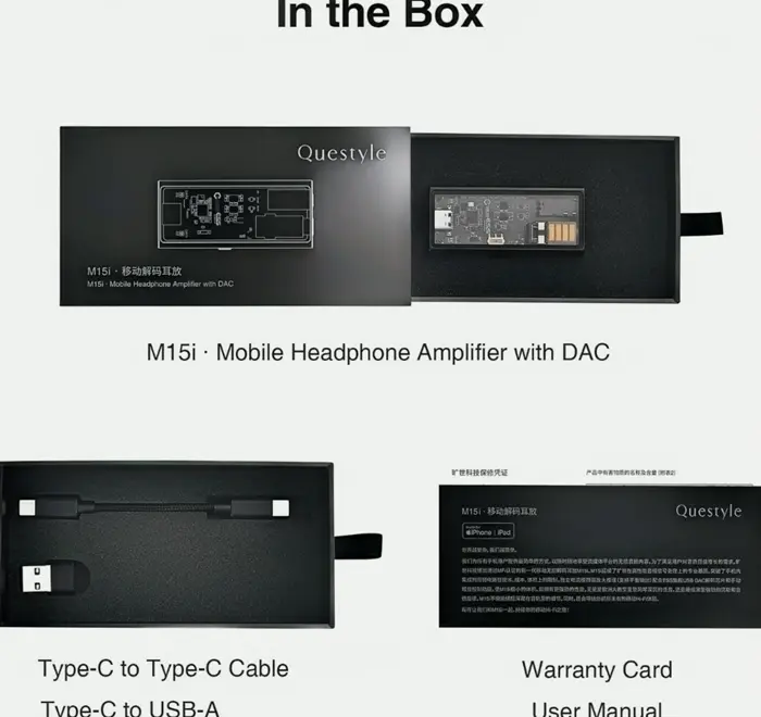 Enjoy high-res audio with the M15 that features the renowned ESS ES9281 DAC, supporting up to PCM768kHz and DSD512. The M15 amazingly processes demanding audio formats. Equipped with four current-mode amplification engines, the M15 supports 3.5mm single and 4.4mm balanced output modes. User gain control allows you choose preferred gains. Optimized with iOS, HarmonyOS, Android, and computers, the M15i supports Windows and Mac systems. Questyle’s current mode tech minimizes errors to 0.0003%, guaranteeing smooth listening with effective energy use. Package includes, 1 unit, Type-C cable, adapter, manual, 12-month guarantee, and helpful support. Note: Buy QC-certified Lightning adapter if using iPhone products.