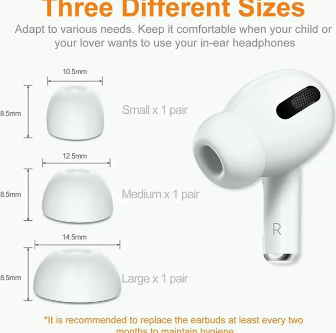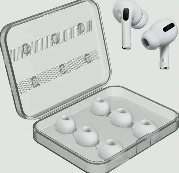 Fits with AirPods Pro models; keep induction and charging. Made from premium silicon, blocks external sounds while maintaining original audio quality. Comfortable for long-term wear; secure fit even during activities. Comes with storage box to protect unused earbuds. Three years guarantee. Note to remove entire pieces such as white cup when changing ear tips.