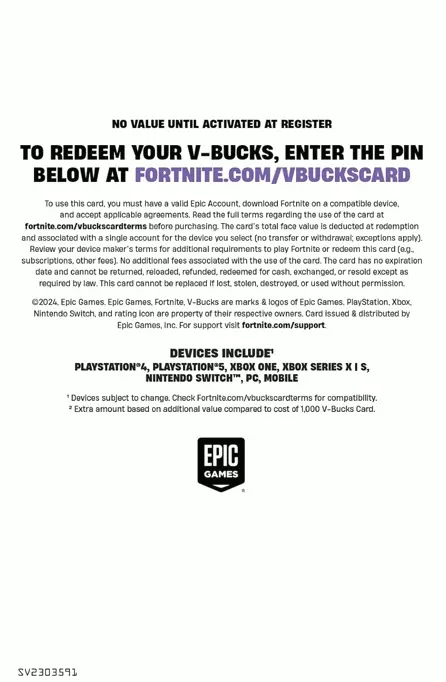 Redemption requires an Epic Account at FORTNITE.COM/VBUCKSCARD. For console gaming (PS5; Xbox; Nintendo Switch), you must link your Epic Games user to your console once to redeem the card. Direct activation on your gaming platform won’t work; use the 16 digit key exclusively at the website. Note: No refunds; responsibility void if lost, stolen, or redeemed on the wrong account.