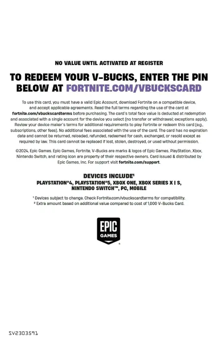 A Fortnite Gaming Account is required in order to redeem a V-Currency voucher code. MUST BE CLAIMED AT fortnite.com/VBUCKSCARD. If using on a console device (PlayStation; X-Box; Switch), you need to link your Epic Gaming account to that platform (1 time) to claim your voucher card code. The sixteen number code you get WILL work if claimed directly through your console device (PlayStation; X-Box; Switch, etc.). No returns; no exchanges; not liable if misplaced, taken or claimed on the incorrect profile.