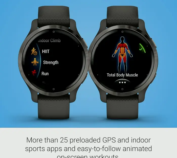 Match your style with a fitness tracker available in two colors featuring a vivid AMOLED display. Get continuous view of your well-being with battery life lasting 10 days in smartwatch mode and up to 7 hours in GPS mode with audio, plus battery saver mode. Know your body better with extensive health monitoring features including health snapshot, Body Battery energy levels, sleep score, fitness age, stress tracking and more (this product is intended to be an approximation of your activity and metrics; it is not a medical device). Use ready-made workouts that include cardio, yoga, strength, HIIT, and Pilates, customize your own in the Garmin Connect app on your compatible smartphone, or utilize Garmin Coach free adaptive training plans to help you get ready for your next fitness challenge. Download up to 650 songs to your watch, including playlists from Spotify, Amazon Music, or Deezer (may require a premium subscription), and pair with wireless headphones (not included) for phone-free listening. With a supported country and payment network, leave your cash and cards at home; Garmin Pay contactless payments let you pay for purchases on the go. Never miss a call, text or social media alert with smart notifications sent right to your wrist — when paired with a suitable Google or Apple smartphone. When paired with a compatible smartphone, safety and tracking features feature incident detection (during outdoor activities) and assistance, both of which send your real-time location to emergency contacts.