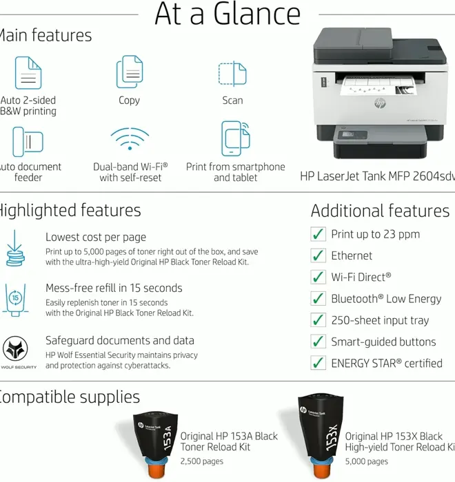 Perfect for compact businesses, this Hewlett-Packard Laser Cartridge 2604sdw has been created for daily black-and-white printing tasks at the minimal cost per sheet. Enjoy powerful productivity – Produce, scan and copy; get tasks done with speedy 2-sided printing and an automatic document feeder. Supplied with upwards of 2 years of toner, print around 5,000 pages immediately. Recharge in no time with clean refill using the affordable, high-capacity Original HP Toner Reload Kit. Print clear reports and forms with superior laser quality. Stay on the go with speedy mobile setup to print, scan, and share at any moment, on the move with the HP Smart app. Work without interruptions; Dual-band Wi-Fi with auto-reset keeps you connected, and Ethernet connectivity makes it convenient to share files. Protect your documents with HP Wolf Essential Security, ensuring privacy and password protection.