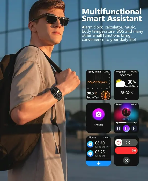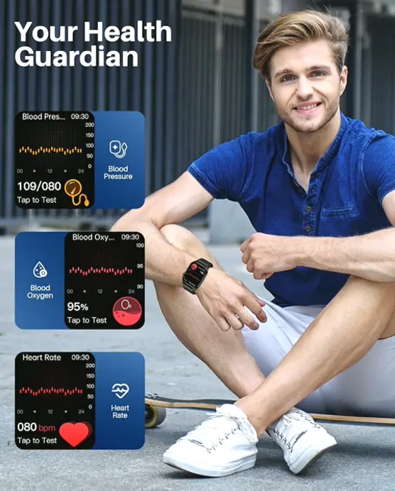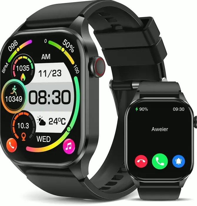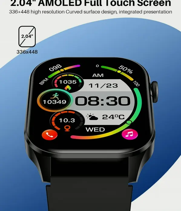 This T98 watch boasts an 2.04-inch AMOLED retina screen, providing an ultra clear viewing pleasure. Continuous Real-time Health Monitoring: Real-time monitor heart beat, blood pressure, O2. 136+ Exercise Activities: Choose among 136+ modes for accurate monitoring. Bluetooth Calling & Notifications: Simple Bluetooth connection for phone calls & messages. Battery Life & Device Matching: Up to 30 days power on idle. Compatible with Google 5.0+/iOS 10.0+. Multiple Practical Functions: Features audio functions, personalized themes, drink reminder, as well as additional.