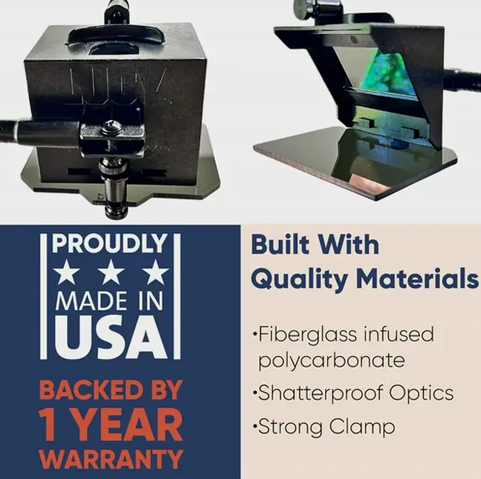 QUALITY USA-MADE WITH YEAR WARRANTY: Proudly Manufactured in the USA with Fiberglass-Infused Polycarbonate, Shatterproof Optics, Solid Aluminum Clamp, and Long-Lasting Arm. We Back Up our Quality Production with a 12-Month Guarantee.