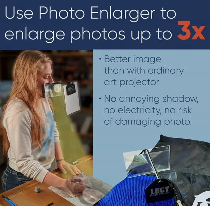 PHOTO ENHANCER AND BAG: Comes with the Image Enlarger, which Enables you to Magnify Pictures, Illustrations, or Small Objects using your LUCY Flexible up to a 3x Magnification. That’s Blowing Up a 4in x 6in Picture to 12in x 18in (10.2cm x 15.2cm to 30.5cm x 45.7cm). Unlike Ordinary Drawing Projectors: No Need to Work in the Dark, Shadow-Free, No Electricity, and No Risk of Damaging Images with a Warm Light. Additionally Includes a Handy Portable Case!