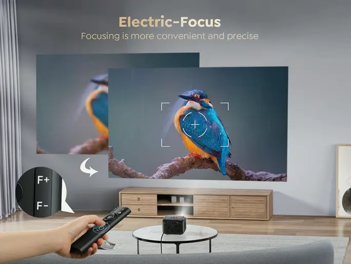 This handy mini projector features upgraded electric focus, which enables users to achieve clear videos at just one click, making manual adjustments a thing of the past. Supporting 1080P HD quality and featuring 15000 lumens brightness, this projector additionally provides an impressive contrast ratio of 20000:1 to produce sharp and vivid colors. Equipped with 2.4G/5G dual-band WiFi, you can benefit from seamless and stable image transmission with no lag, while Bluetooth 5.2 connectivity allows for simple pairing with Bluetooth headphones and other gadgets. The ±40° electric keystone correction feature ensures optimal visual alignment even of viewing angles, and the adjustable zoom feature lets users choose a screen size ranging from 60” to 120” without adjusting the distance. With multiple interfaces like HDMI, USB, and audio, the TR25 mini projector can connect with various devices, making it ideal for family entertainment. TOPTRO offers a 1-year free replacement and 3-year maintenance warranty.