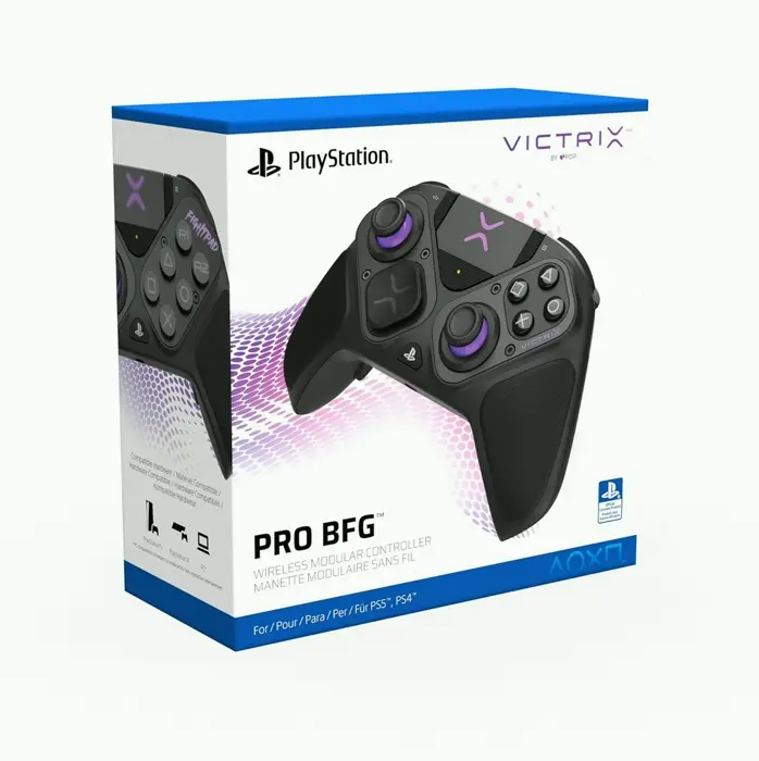 The BFG is the top esports gamepad for PlayStation with boasts won various awards in Game and Technology, including: Best Gaming Accessory (SHN), Best Customizable Controller (Esquire), as well as 2023 iF Design Honor. Full Cordless & Wired Compatibility including High Grade Sound – With the Mode Switch, gamers can switch between PS5, PS4, and PC (using X input) systems. Immerse yourself the superior sound quality via the audio jack, in sync with PS PS5 3D Sound. Complete Customization – The Left Module can flip 180 degrees to use with the standard PlayStation joystick setup or alternative joysticks. Enthusiasts of combat titles can swap in the Fight Pad module, to replace the Right Joystick with six microswitch keys. Firmware Update (PC Exclusive) – Patch to extend battery life to twenty hours of play while improve cordless performance. Download the Victrix App to program rear buttons, reassign face buttons, adjust trigger dead zones, run tests, remedy stick drift and more. Four Remappable Rear Buttons & Adjustable Clutch Triggers – Map back buttons with the Light Configuration Button, then save and save up to three profiles on the gamepad. The exclusive clutch triggers have five adjustable points for customizable tuning.