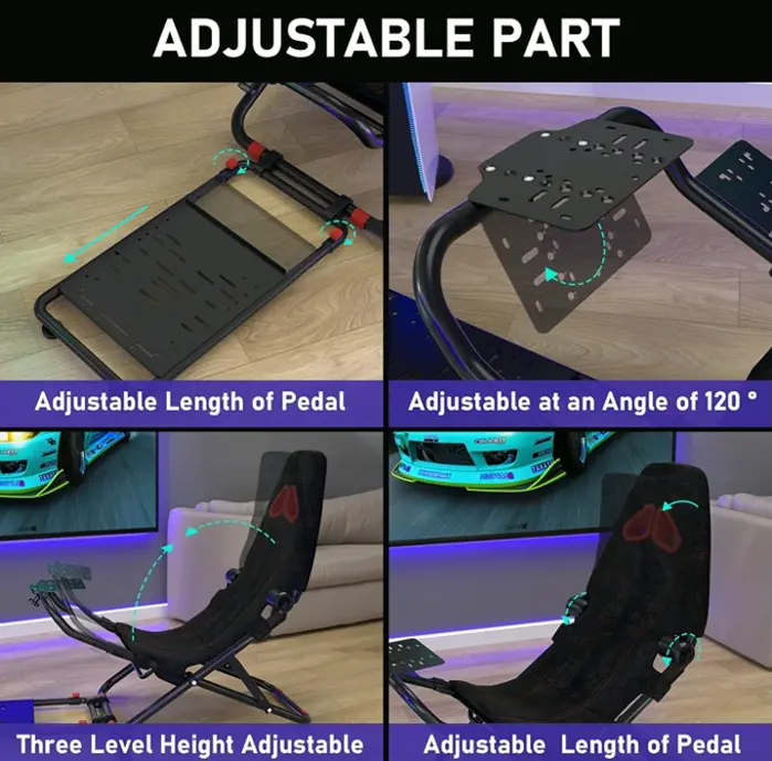 Minimal Assembly: Just unwrap the Simulator racing cockpit, customize to your desired angle, and begin playing. The assembly requires just 10 minutes! Works with Most Racing Wheels: The RACGTING is compatible with most wheel models, including Logitech G29, G920, G923, G27, G25, and Thrustmaster T248, T248X, T300RS GT, T150, T80, TX, T-GT, TS-PC, TS-XW. Usable with PS5, PS4, Xbox One, and PC systems. (Note: Wheel, shifter, and pedals are NOT included.) Space-saving Design: The innovative design enables simple stowage without occupying too much space in your home. Comfortable Cockpit: The RACGTING features carbon steel brackets and sturdy, soft suede seats, ensuring excellent stability and can support up to 110KG. Personalized Adjustments: Adjust the length of the footrests, the angle of the steering wheel tray, right positions of the shifters, and the angle of the chair as per your need. Ergonomically structured, create your perfect setup! Customer Satisfaction: If you have any questions, don’t hesitate to contact with us. We are committed to provide quick assistance.
