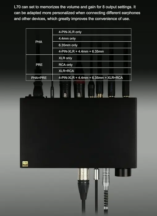 Supports both balanced and single-ended headphone jacks, including 4-pin XLR, 4.4mm, 6.35mm, and 3.5mm jacks, the L70’s built-in well-designed balanced amplifier mechanism facilitates exceptional performance for all headphones.