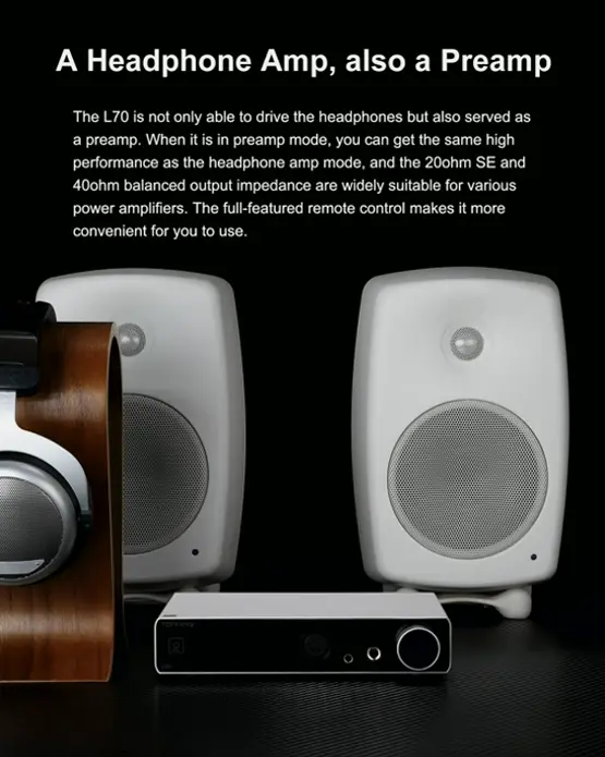 Moreover, the L70 works not only as a audio amplifier but also as a preamp. In preamp mode, your get the same high performance offered by the headphone amp function, with 20ohm SE and 40ohm balanced output impedance fitting for various power amplifiers. The included remote control makes operation a lot more user-friendly.