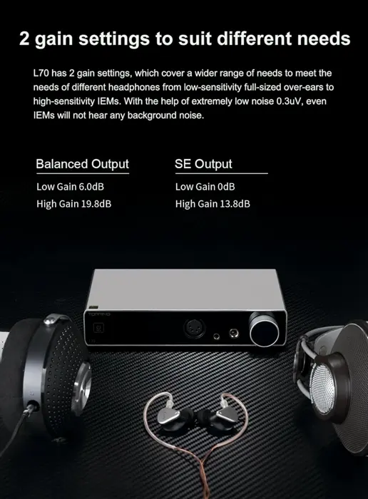Versatile Gain Settings – The L70 comes with 2 amplification settings to cater to different needs, accommodating both low-sensitivity full-sized headphones and high-sensitivity IEMs. Even its remarkably low noise level of 0.3uV, even IEMs are free from noticeable background noise.