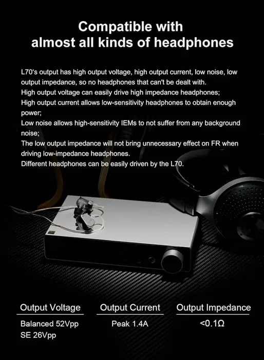 Enjoy superb audio quality with the L70. Featuring Ultra-High Performance NFCA components, the L70 uses the same Nested Feedback Composite Amplifier system as the A90. Its hybrid feedback design provides remarkably low THD+N and an unparalleled 146dB dynamic range. Furthermore, it offers substantial output current capability, ultra-low output impedance, and near-zero noise of 0.3uV, that placing it miles ahead of the rivals, making it ideal for powering headphones of diverse impedances, ensuring vividly rendered high-fidelity audio.