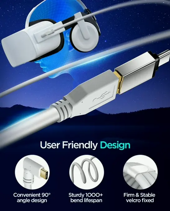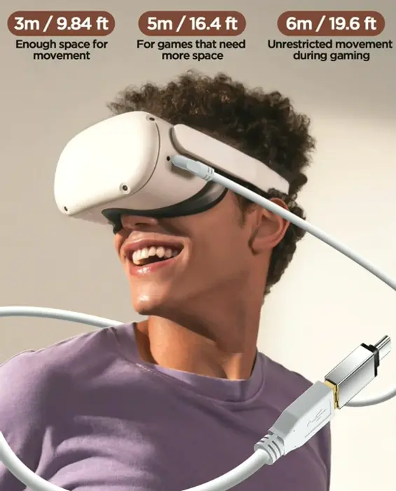 Long and Flexible: 9.8ft feet long enables free mobility during gaming, watching movies, or enjoying music. The L-shaped design protects your Quest 2 port.