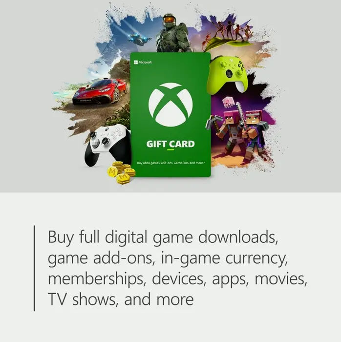 Xbox Voucher: Purchase full digital game downloads, add-ons, virtual currency, memberships, devices, apps, films, TV shows, and more. Online Games: Select from a multitude of titles, from AAA to indie choices. Start playing the second your anticipated game is released when you reserve and pre-install it. Game Extensions: Extend the experience of your favorite games with add-ons and in-game currency. MOVIES & TV SHOWS: Rent or buy latest movies and TV shows from a vast library. Ideal Present: Great as a present to a friend or for personal use. Xbox Vouchers are easy to use, never expire, and allow the choice to pick the gift they desire. Enjoy more ways to play without a credit card linked to your Microsoft account.